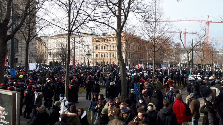 Rund 3000 Teilnehmerinnen und Teilnehmer versammelten sich zu einer Kundgebung gegen die CoV-Maßnahmen. Zahlreiche Demonstranten versuchten am Nachmittag von unterschiedlichen Startpunkten aus in Richtung Ring zu marschieren. CoV-Demonstration in Wien aufgelöst.